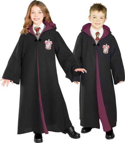Includes Black ankle length robe with attached hood, burgundy accents, front close clasp and an embroidered Gryffindor Crest patch on the front. This is an officially licensed Harry Potter costume. Available in Child sizes: Small (4-6), Medium (8-10), and